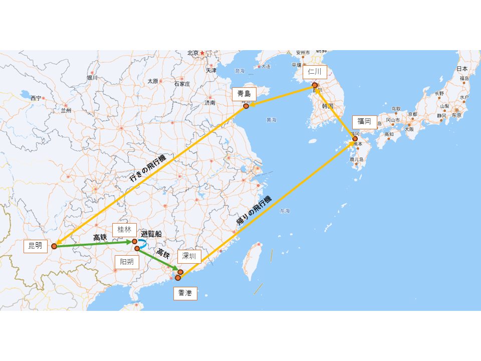 予定では福岡→昆明でした。9時ごろ発、20時頃着