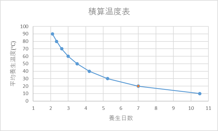 低温調理器があれば、下図の「積算温度表」のように養生期間を短縮できる。私は60℃で72時間養生している。積算温度については「積算温度 コンクリート」で検索すればでてくる。